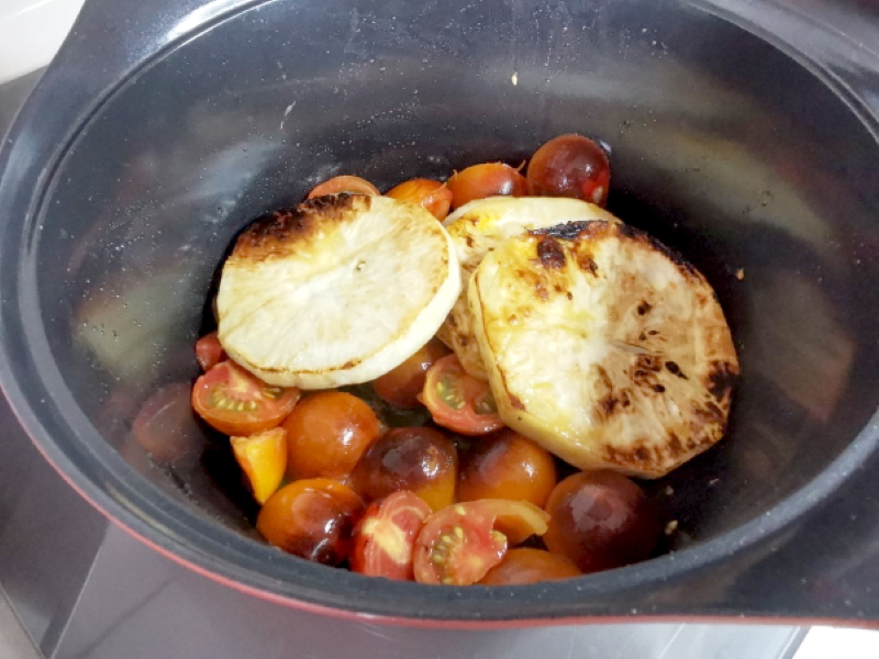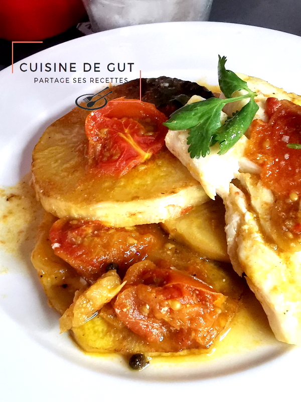 Vu que j’avais testé ces tomates prunes cuites dans ma dernière pissaladière et que je les ai trouvées fameuses, j’ai décidé qu’elles viendraient compléter mon plat et me faire la sauce qui m’était nécessaire pour cuire mon poisson. Le cabillaud cuit 10 minutes dans une sauce c’est toujours un régal ! Après j’ai laissé parlé mon imagination pour le reste et voici ce que cela a donné.