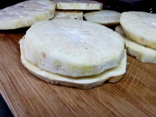 - Retirer le fond de la boule de céleri puis couper la boule de céleri en tranches d’1 cm