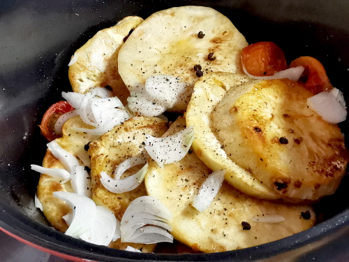 3- Vérifiez la cuisson de temps en temps. Il dot y avoir du liquide durant la cuisson qui doit être longue et douce.