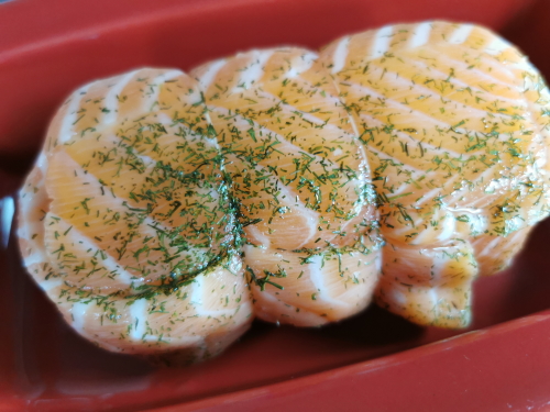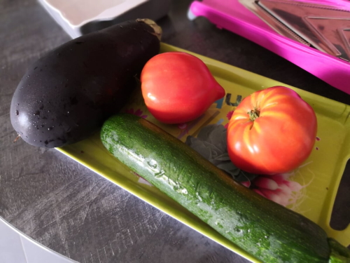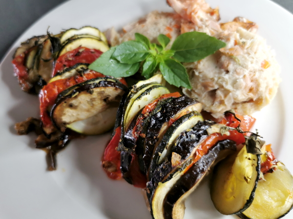Du coup pour rester fidèle à la recette (exigence de notre Yolande) et bien que d’habitude je lui ajoute soit des rondelles de mozza, soit tes tranches très fines de pommes de terre, je l’ai fait comme il se doit : avec des aubergines, de belles tomates coeur de boeuf et des courgettes. Le tout parfumé d’ail, de thym frais, de Basilic et d’origan. J’ai profité de l’achat d’un petit rôti de saumon fourré au poisson et noix de st jacques pour en faire mon accompagnement.