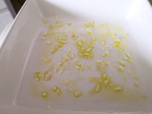 • Répartir ensuite la gousse ciselée dans le fond du plat avec un filet d’huile d’olive