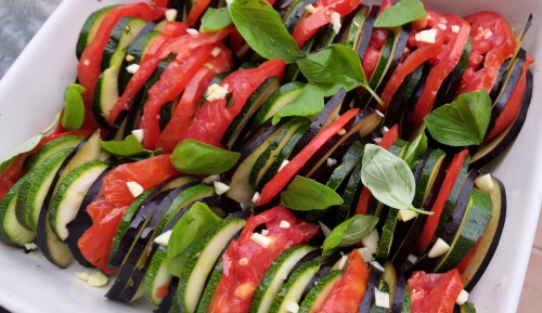 • Monter alors le tian en installant les rondelles de légumes debout et en les mélangeant harmonieusement