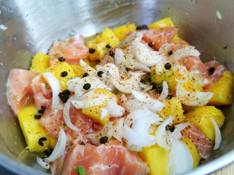- Ajouter ces cubes de saumon à la mangue. Remuer le tout