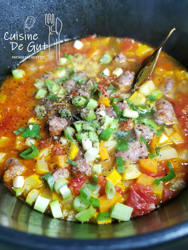 Eh bien je pensais pas que l’on se régalerais autant ce soir là car 2 h avant le manger je ne savais toujours pas ce que l’on mangerait ! Cette soupe est vraiment super bonne car bien parfumée. Je l’avais bien relevée avec le poivre et l’ajout de mes petites rondelles de pain était tellement sympa que j’en ai refait ! Une ce n’était pas assez ! 🙂 Bien vu la saucisse dans ce type de plat !! à refaire !