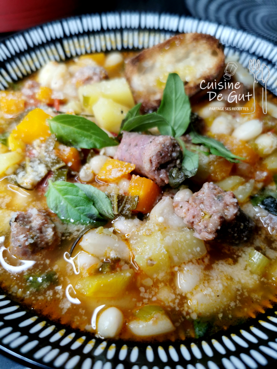 Cette soupe m’a convaincue grâce à la présence de saucisse et le fait que les légumes restaient en morceaux. Je trouve ça plus gourmand que les moulinés.