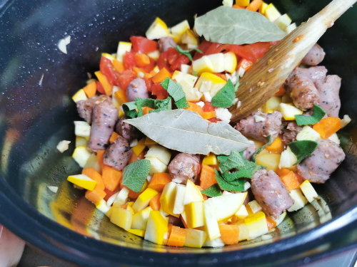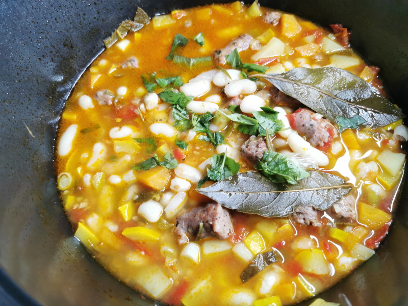 En règle générale dès que je fais des haricots blancs il m’en reste toujours, ce qui n’est pas bien grave car j’adore les terminer en salade. Je venais de faire mon sauté d’agneau et j’avais donc mis au frais le reste de mes haricots en prévision d’une petite salade quelques jours après, lorsque mon amie Irisa du site Cuisine et couleurs a publié une soupe style minestrone avec des saucisses.