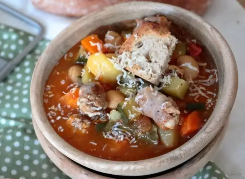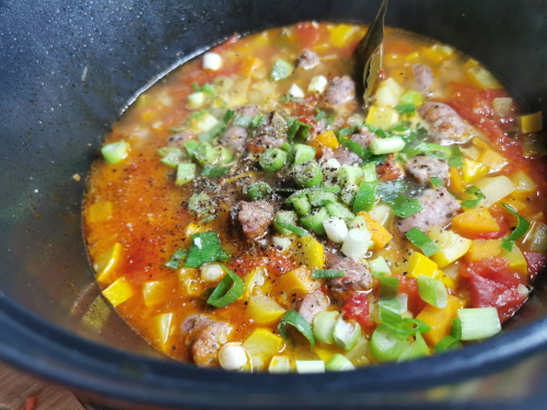 Soupe de légumes d’été et saucisses aux herbes