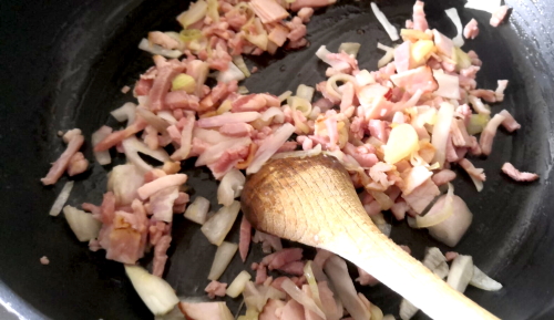 • Mettre un léger filet d’huile dans une poêle et faire revenir les morceaux de bacon avec l’oignon ciselé et laisser cuire doucement.
