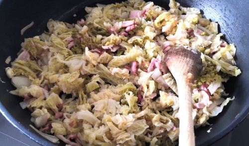• Ajouter le chou, l’oignon  et le bacon. Mélanger