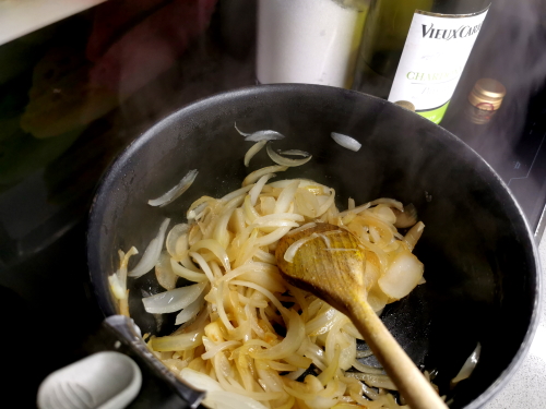 - Verser un très léger filet d’huile dans une casserole et quand l’huile est chaude ajouter les oignons.