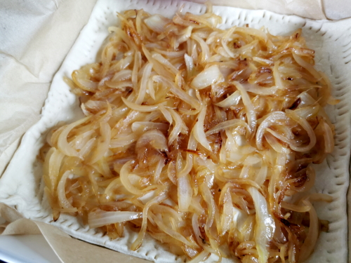 - Etaler sur la pâte feuilletée les oignons.