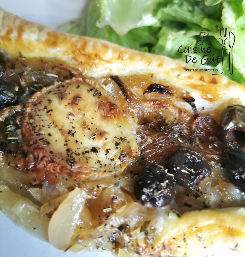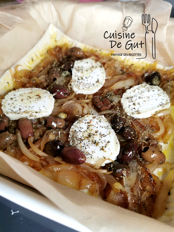 Tarte aux oignons, olives et chèvre parfumée à l’origan