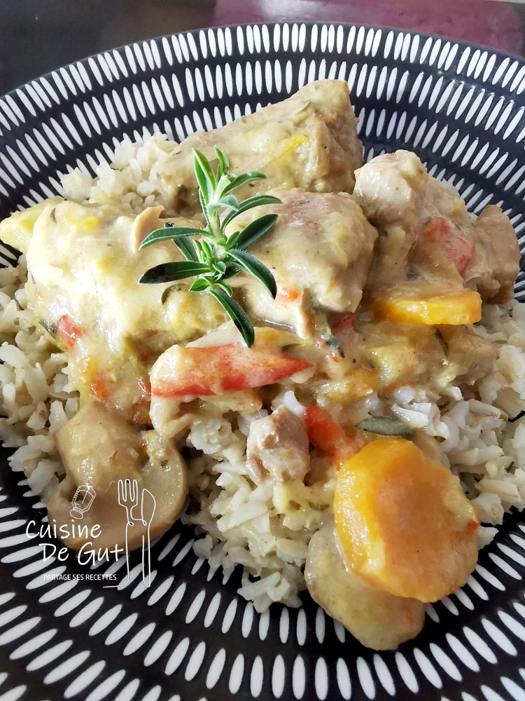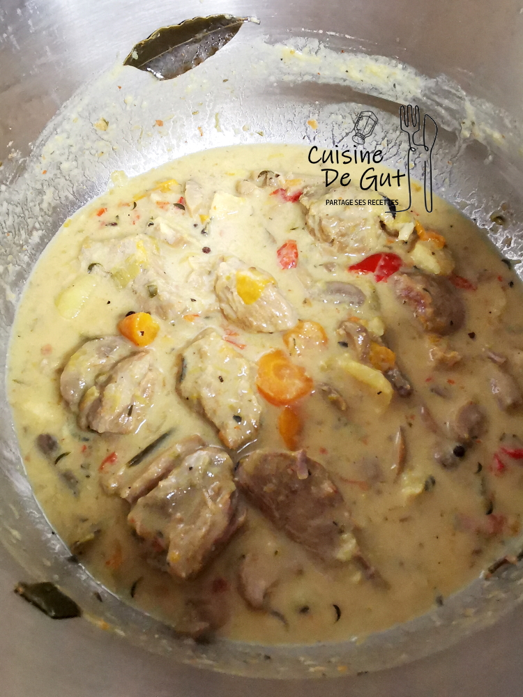 Voilà un plat que je ne savais vraiment pas comment appeler, car si c’est bel et bien une blanquette de veau dont il s’agit, elle est un peu particulière. Il me restait un potage de légumes que j’avais servi en morceaux. Il était constitué de Panais, poivron rouge, pommes de terre, carotte et poireaux que j’avais parfumé à l’origan et au curcuma. J’en avais fait de trop mais je voulais terminer mes légumes avant de refaire mes courses.