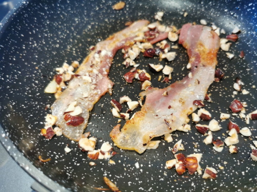 • Dans la même poêle et sans ajout de gras, faire cuire les tranches de lard et ajouter les noisettes.