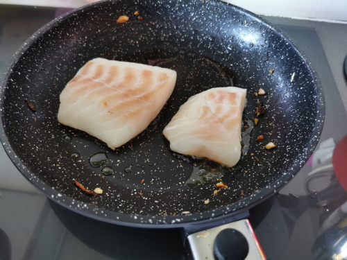 • Dans une autre poêle ajouter un mince filet d’huile d’olive et faire cuire les morceaux de cabillaud, après les avoir épongés avec une feuille de sopalin. Saler et poivrer
