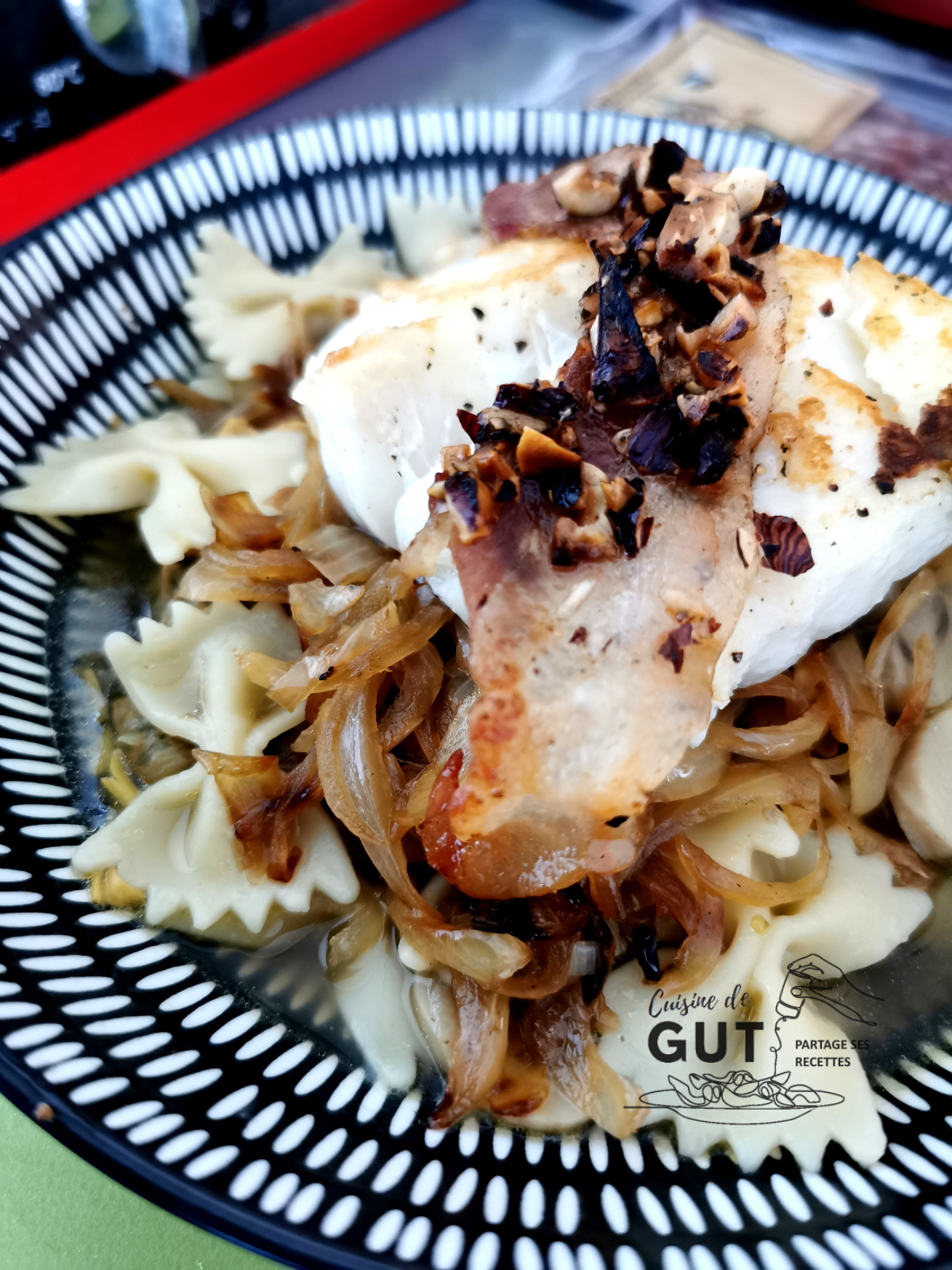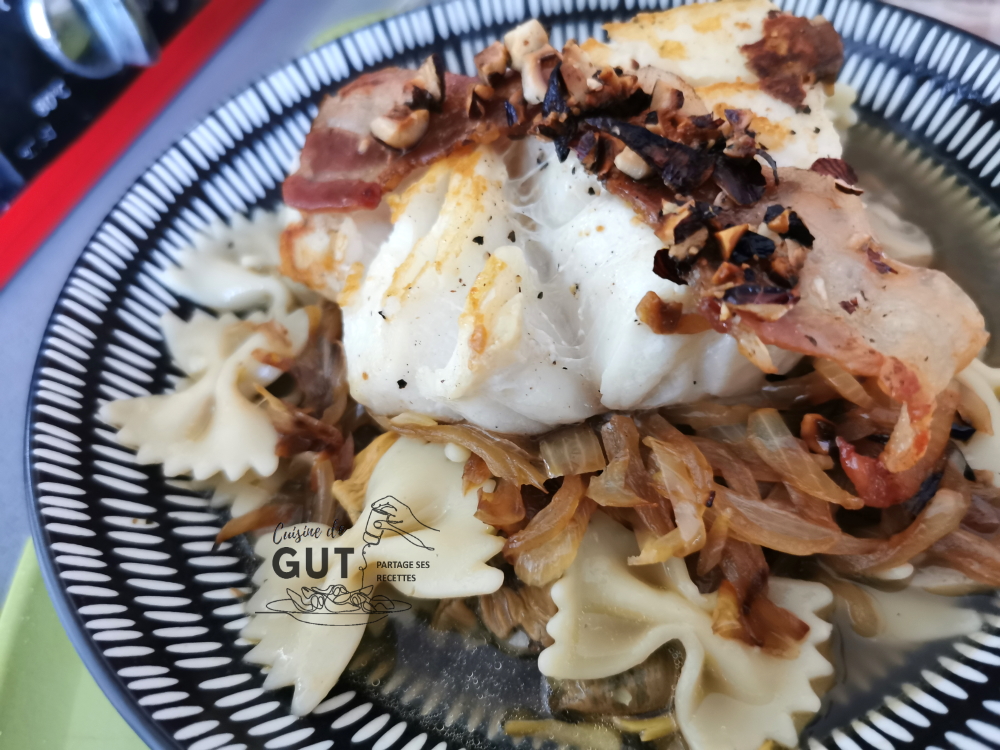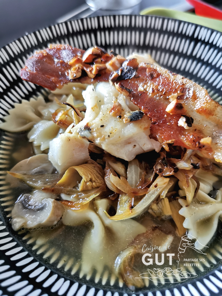 Ce plat était fort bon, même si j’ai regretté ne pas l’avoir fait avec des cèpes, mais je pense qu’il va être aimé tout de même. Dans ce plat le cabillaud n’est pas poché mais cuit à la Poêle mais c’est quelque chose que je fais souvent, ca fait moins de vaisselle donc moins de désordre et le poisson est toujours fort bien cuit comme j’aime. Tu peux essayer ce type de cuisson tu verras, tu te régaleras.