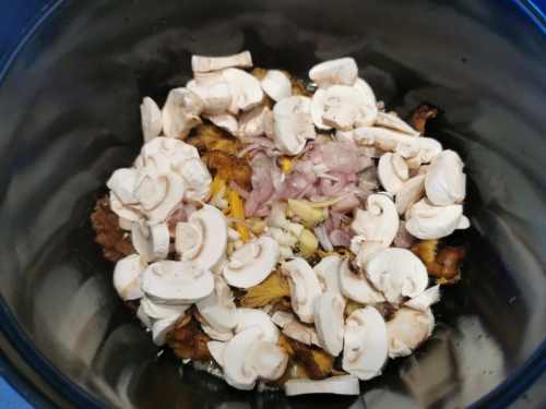 • Ajouter sur les champignons (et pâtes éventuellement) une portion d’oignon caramélisés