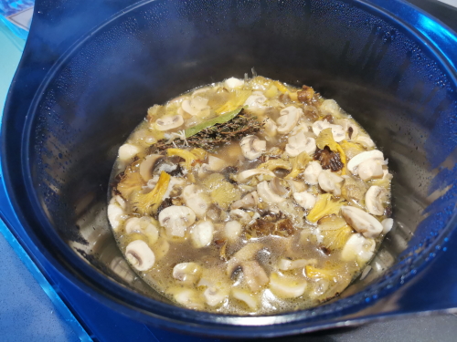 C’est parce que Noël approche et que nous allons avoir à cette occasion fille et petites filles, que je me suis lancée pour l’essayer, ce plat tout simple mais bien gourmand. Il l’aurait été encore plus si j’avais eu la chance d’avoir des cèpes car le bouillon aurait été encore plus parfumé mais bon, j’ai fait avec ce que j’ai trouvé : Des chanterelles jaunes et des champignons de Paris. C’est un plat que je pourrais servir le lendemain du réveillon car il est très léger. Tout à fait ce qu’il faut après les excès. Ici, j’ai ajouté un lit de pâtes pour combler l’appétit de mon mari, mais on peut tout à fait ne mettre que les champignons en légumes.