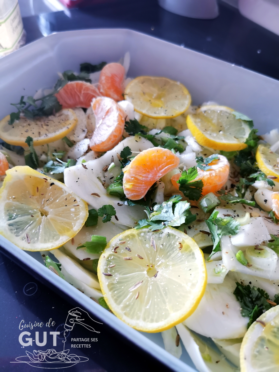 Le fenouil est excellent lorsque l’on a des soucis au niveau de l’estomac et le citron, contrairement à ce qui se dit, est tout à fait indiqué lorsque l’on souffre de reflux gastrique. C’est mon cas, alors malgré le fait que le fenouil n’est pas encore en pleine saison, j’ai voulu tester cela, si ça peut me soulager je ne demande pas mieux. Pour accentuer le parfum anisé, j’ai ajouté des graines de fenouil et pour compléter le citron j’ai ajouté des clémentines. Un peu de coriandre et d’oignon blanc, ca va me plaire je le sens !