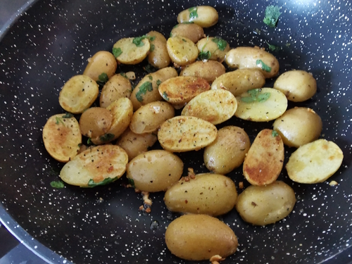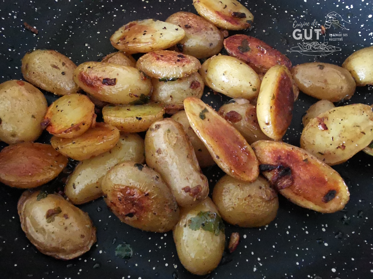 1- Surveiller les grenailles et les remuer de temps en temps. Pour aider leur cuisson vous pouvez couvrir la poêle mais pas avant que les grenailles ne soient dorées.