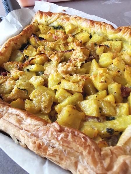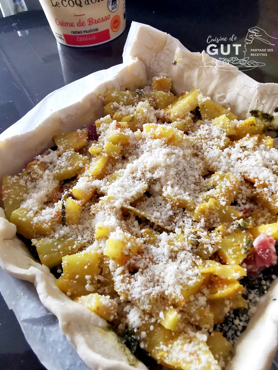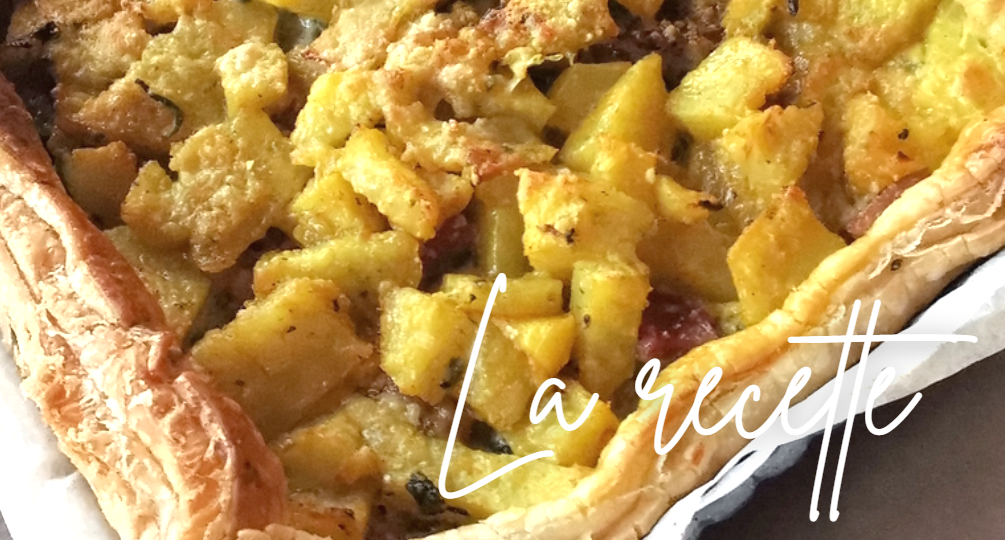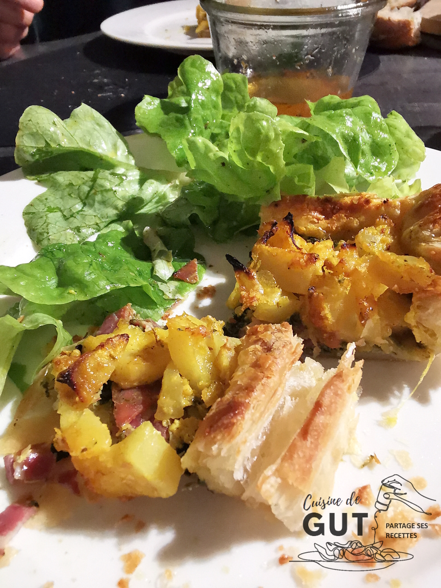 Je suis franchement contente de moi car cette tarte est innovante, vous ne la trouverez pas sur le net !! C’est complètement inventé c’est franchement réussi !! A servir un dimanche soir puisque c’est notre repas fétiche en général une bonne tarte salée !