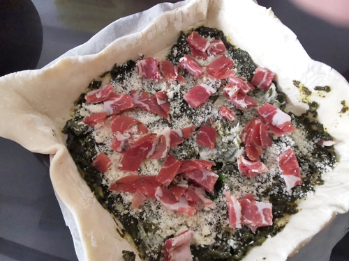 Lorsque je fais des tartes, je mets souvent ma garniture sur un lit de quelque chose comme un lit d’oignons cuits, une tartinade, des tranches de bacon etc… Je cherchais quoi mettre sous le céleri quand j’ai vu mon oseille que je venais d’acheter. J’ai de suite pensé que fondue avec un peu de crème, ça pourrait le faire. Je l’ai donc étalée en fond et soupoudrée de parmesan râpé. Comme je mets pratiquement toujours un peu de protéines dans mes tartes, j’y ai ajouté un peu de coppa. Plutôt curieux tout ça me direz vous ? Vous avez raison mais j’aime l’originalité et quelque chose me disait que ce petit mélange allait se révéler délicieux….