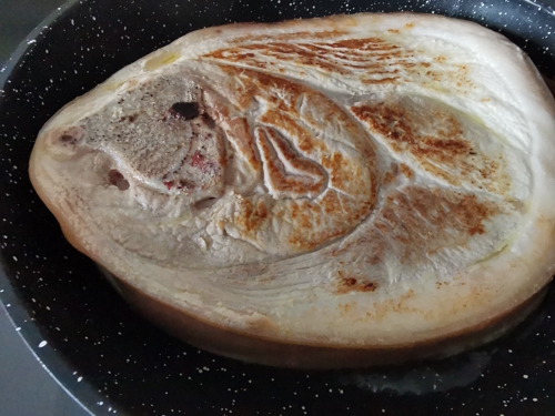 • Mettre un filet d’huile dans une grande poêle et lorsqu’elle est bien chaude saisir la rouelle sur les deux faces.