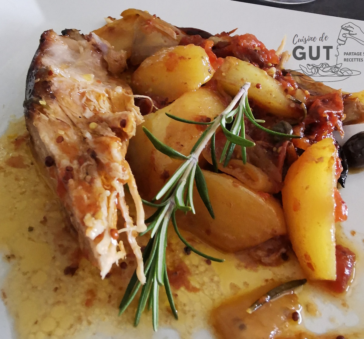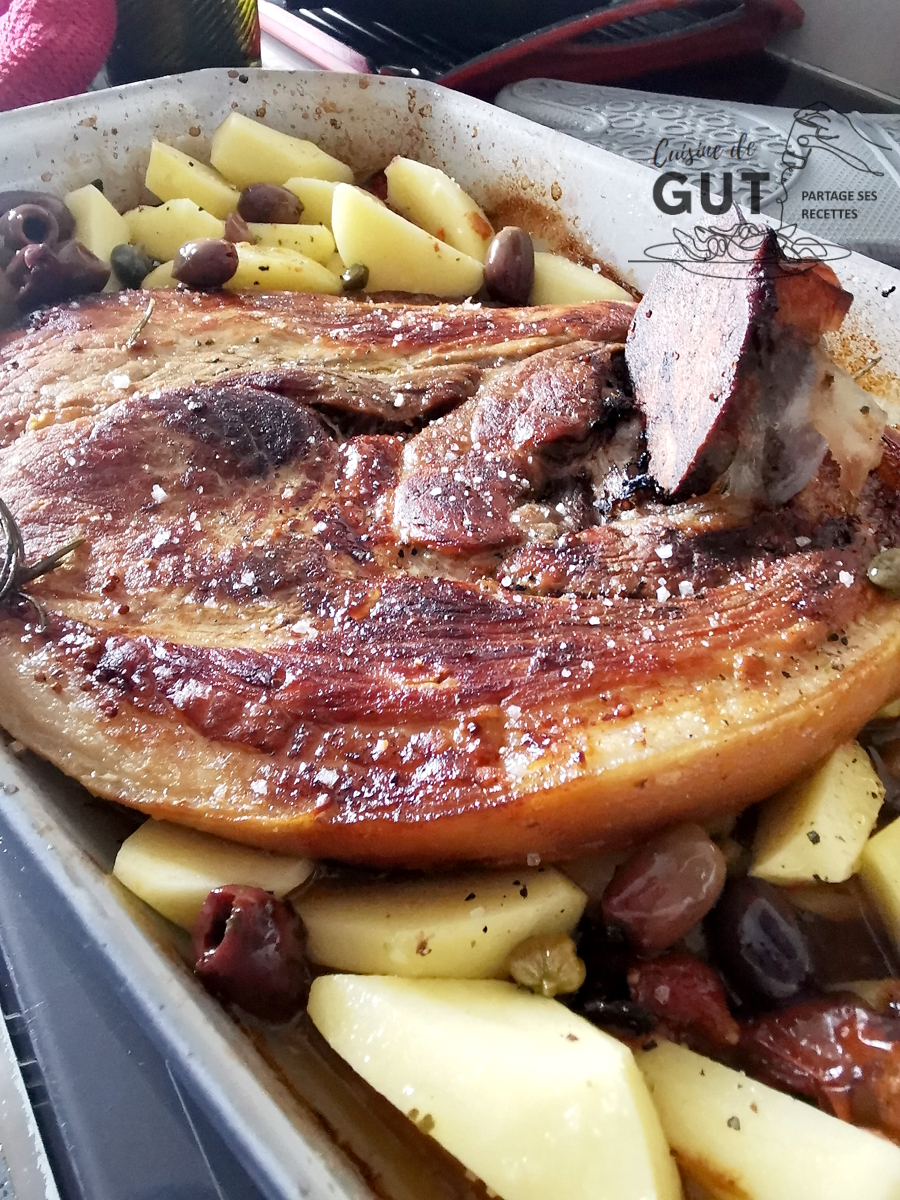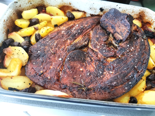 M’étant souvenu de celle de mon amie Lou (Une aiguille dans le potage) dont les photos m’avaient carrément fait baver, j’ai décidé de la faire au four comme elle. Lou l’avait cuisinée avec de la bière, je n’en avais pas alors j’ai mis du vin blanc. J’ai gardé son idée de tomate que je trouvais trop top, mais j’ai complété avec des pommes de terre. J’ai parfumé le tout de romarin et comme mes petites olives Bressanes, qui étaient sur mon plan de travail, m’ont fait un petit clin d’oeil, j’en ai ajouté une cuillère à soupe. Je sais que beaucoup d’entre vous y ajoutent de la moutarde alors c’est ce que j’ai fait après l’avoir badigeonnée de sirop d’agave. Il me tardait de goûter à tout ça !