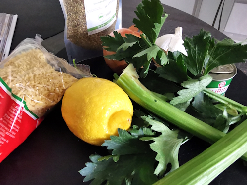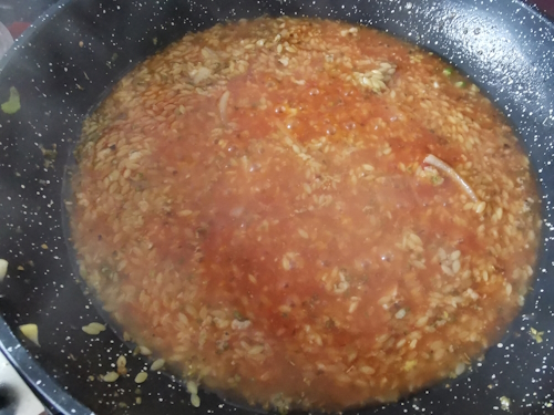 - Ajouter les pâtes et le concentré de tomate puis ajouter le bouillon, l’origan et le zeste du citron.
