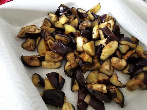 - Faire chauffer un bon filet d’huile d’olive dans une sauteuse et ajouter les cubes d’aubergines