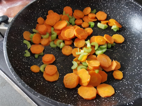 - Faire revenir les carottes et le céleri dans la même poêle puis débarrasser