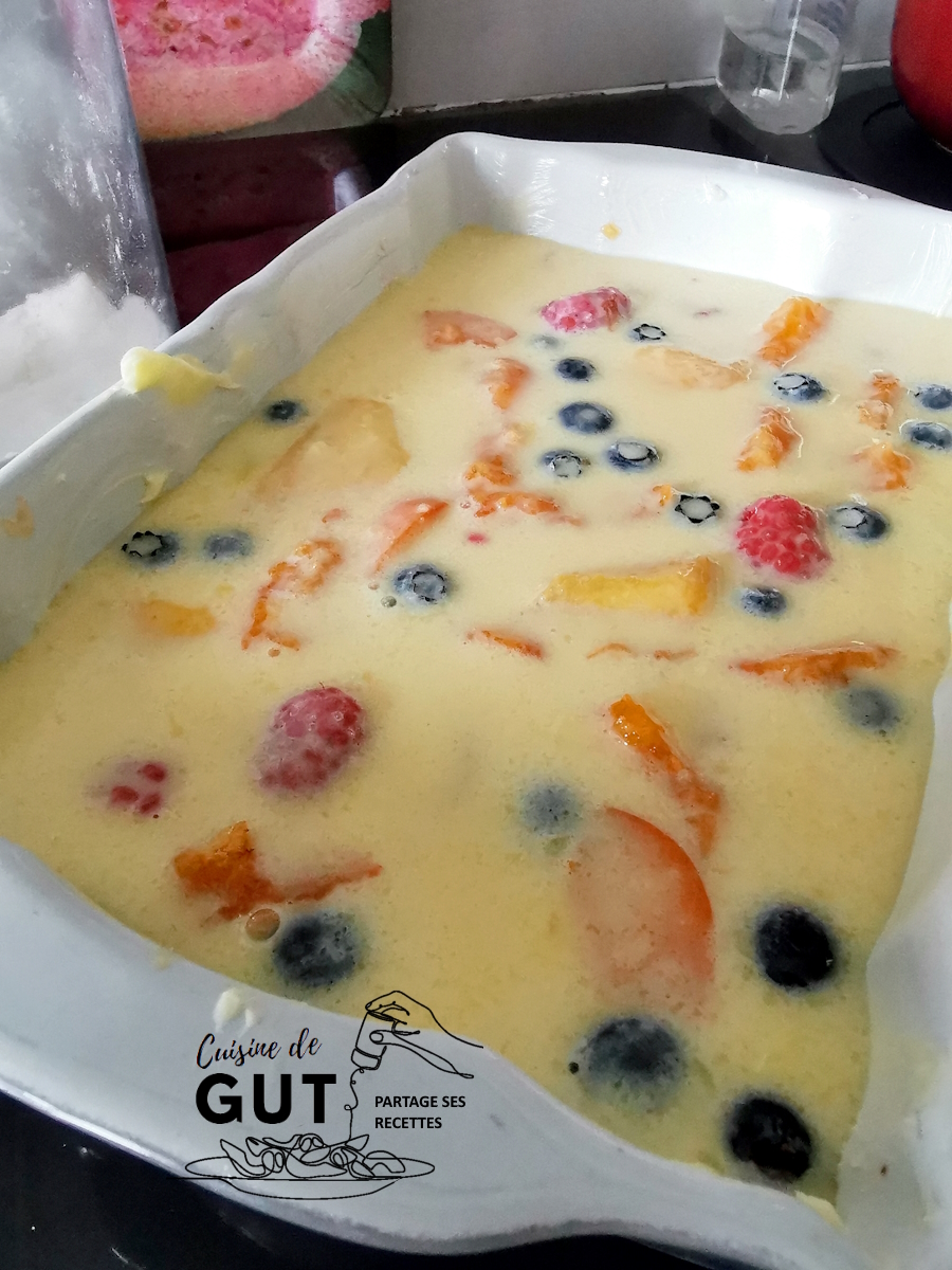 - Bien mélanger le tout (il ne doit pas y avoir de grumeaux, sinon passer la préparation à la passoire avant de la verser sur les fruits)