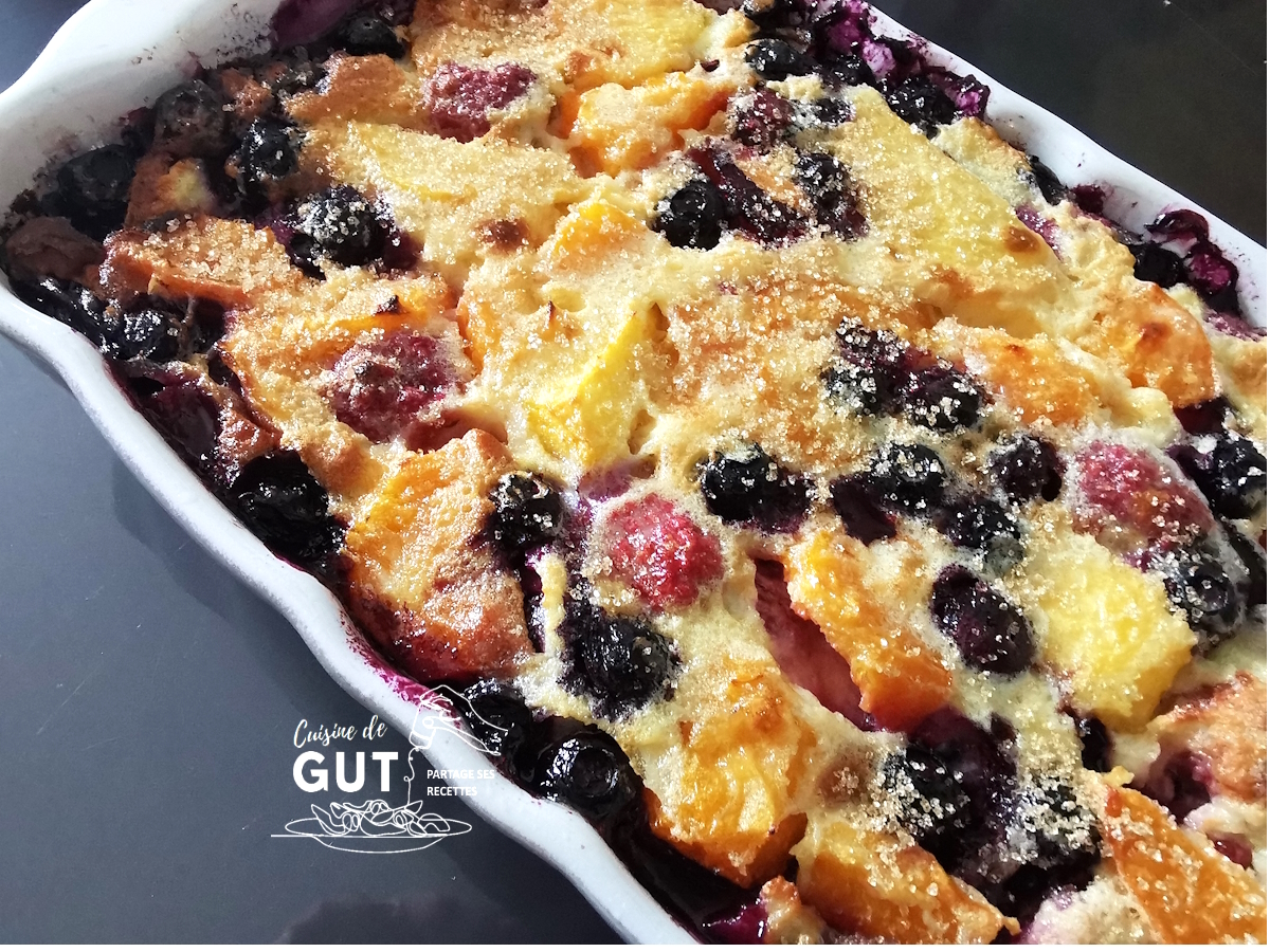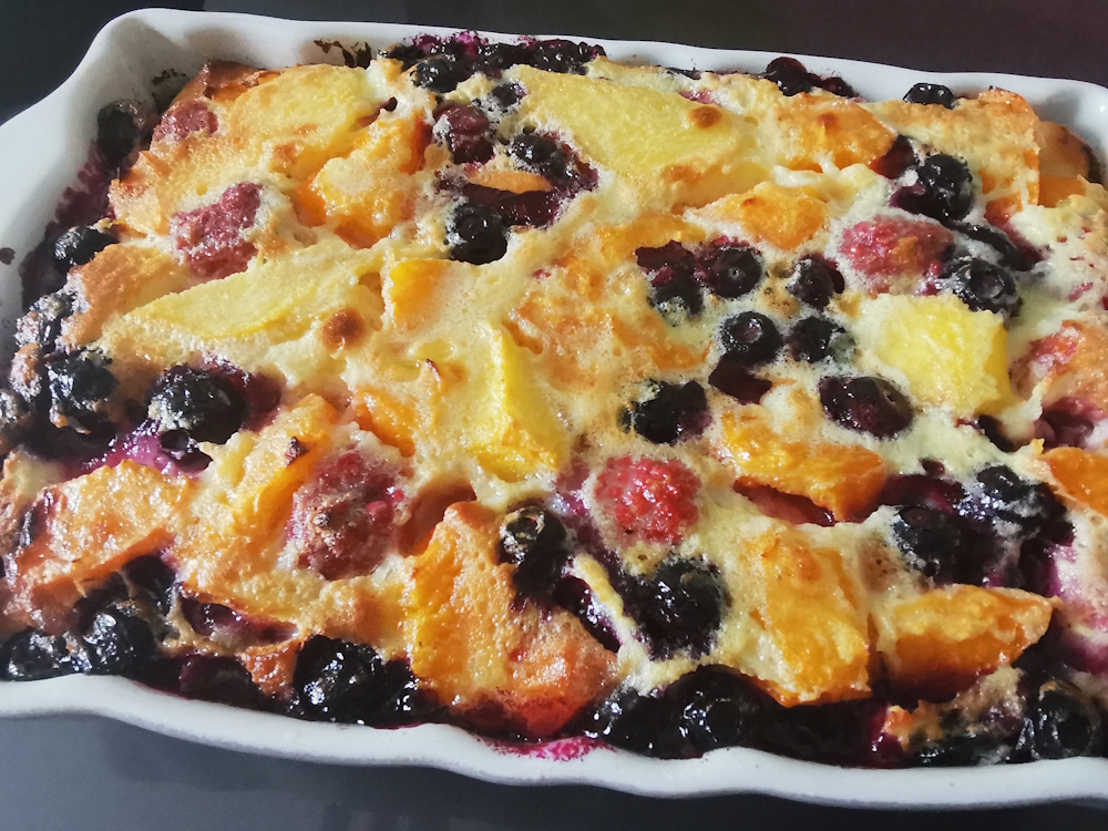 Dans ma liste de desserts préférés, on trouve en premier tous les desserts aux fruits et s’il n’en restait qu’un ce serait un clafoutis, ce gratin y ressemble beaucoup, tutti frutti, c’est parfait et absolument délicieux