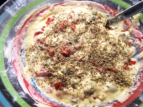 • Puis, ajouter le jambon et les poivrons, mélanger à nouveau.