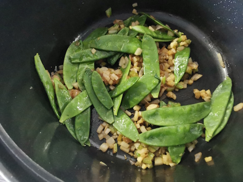 • Ajouter les pois gourmands, remuer le tout et laisser cuire une dizaine de minutes en remuant souvent