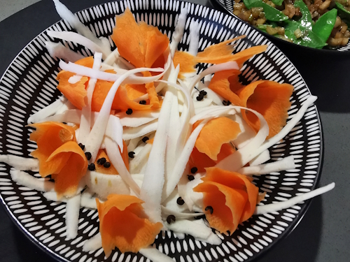 Je ne connaissais pas cet ustensile bien pratique, les corolles de carottes sont parfaites pour accueillir les noix, cela fait une assiette joliment gourmande j’aime beaucoup !!