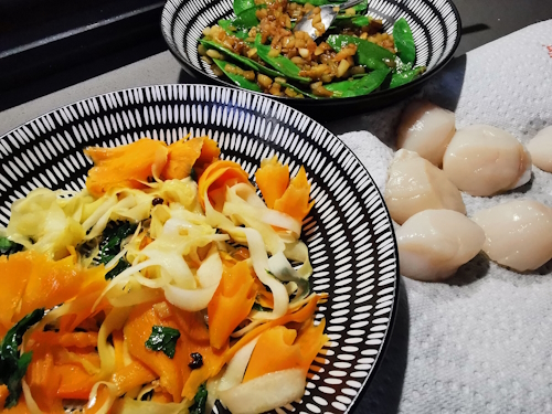Je les propose souvent en entrée comme mon tartare de St-jacques aux clémentines mais là c’est en plat principal que je voulais les faire. J’avais très envie de leur donner un petit côté asiatique, mais comment ? C’est en faisant mes courses et en choisissant les légumes qui pourraient les accompagner que s’est dessinée la présentation dans ma tête et du coup c’est comme ça que j’ai su comment j’allais procéder. J’espérais que ce serait bon car pour un réveillon je ne voulais surtout pas le rater !