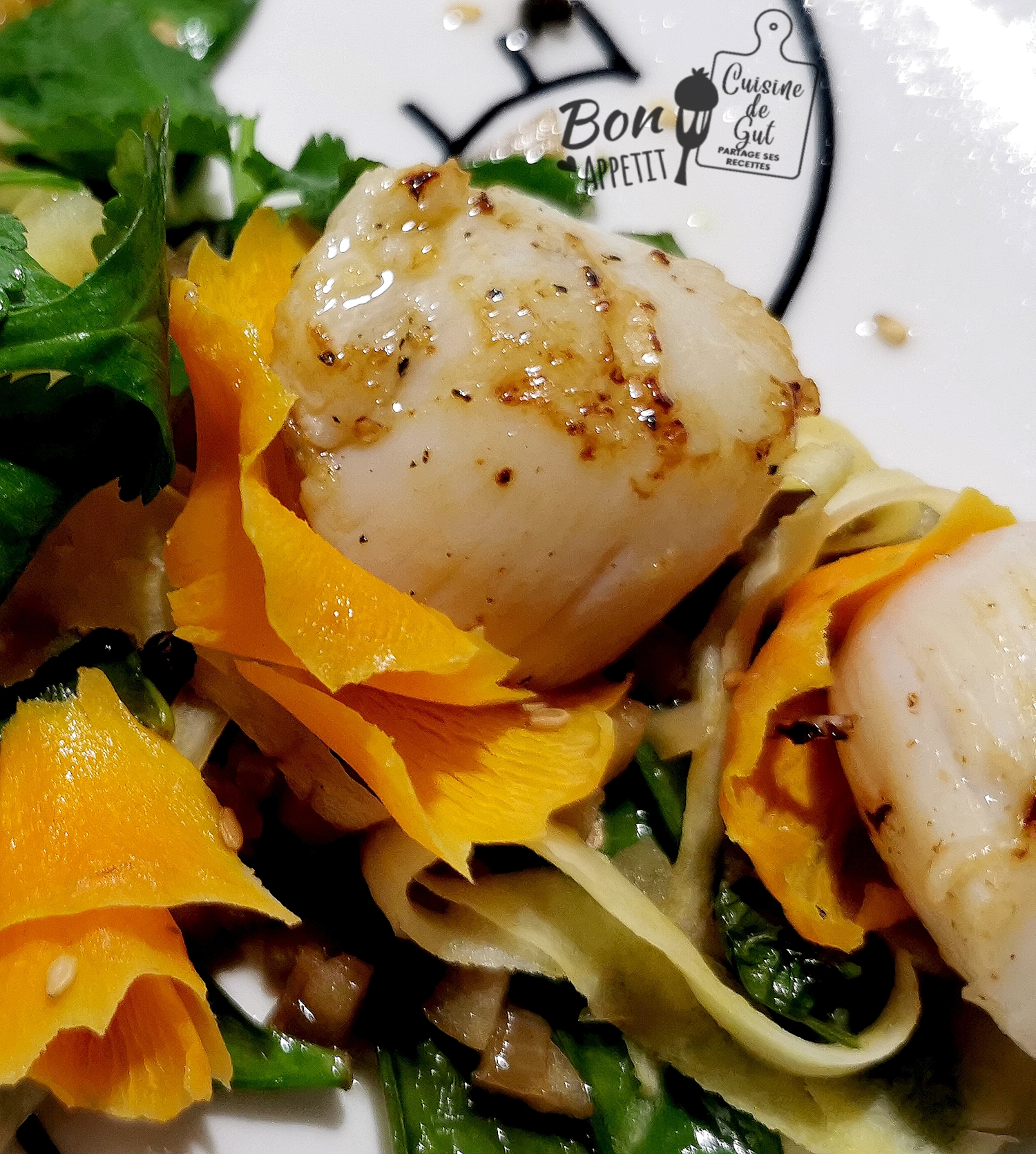 3. Avec ces différents légumes croquants et ces saveurs asiatiques, ton plat fait envie ! Je profite aussi que nous soyons peu nombreux pour cuisiner les St Jacques sinon cela revient trop cher. Tu as bien fait d’innover, le résultat est joli comme tout. Je te souhaite une bonne semaine, je t’embrasse