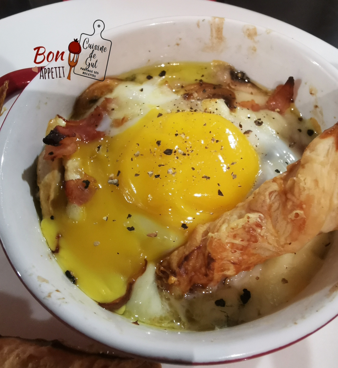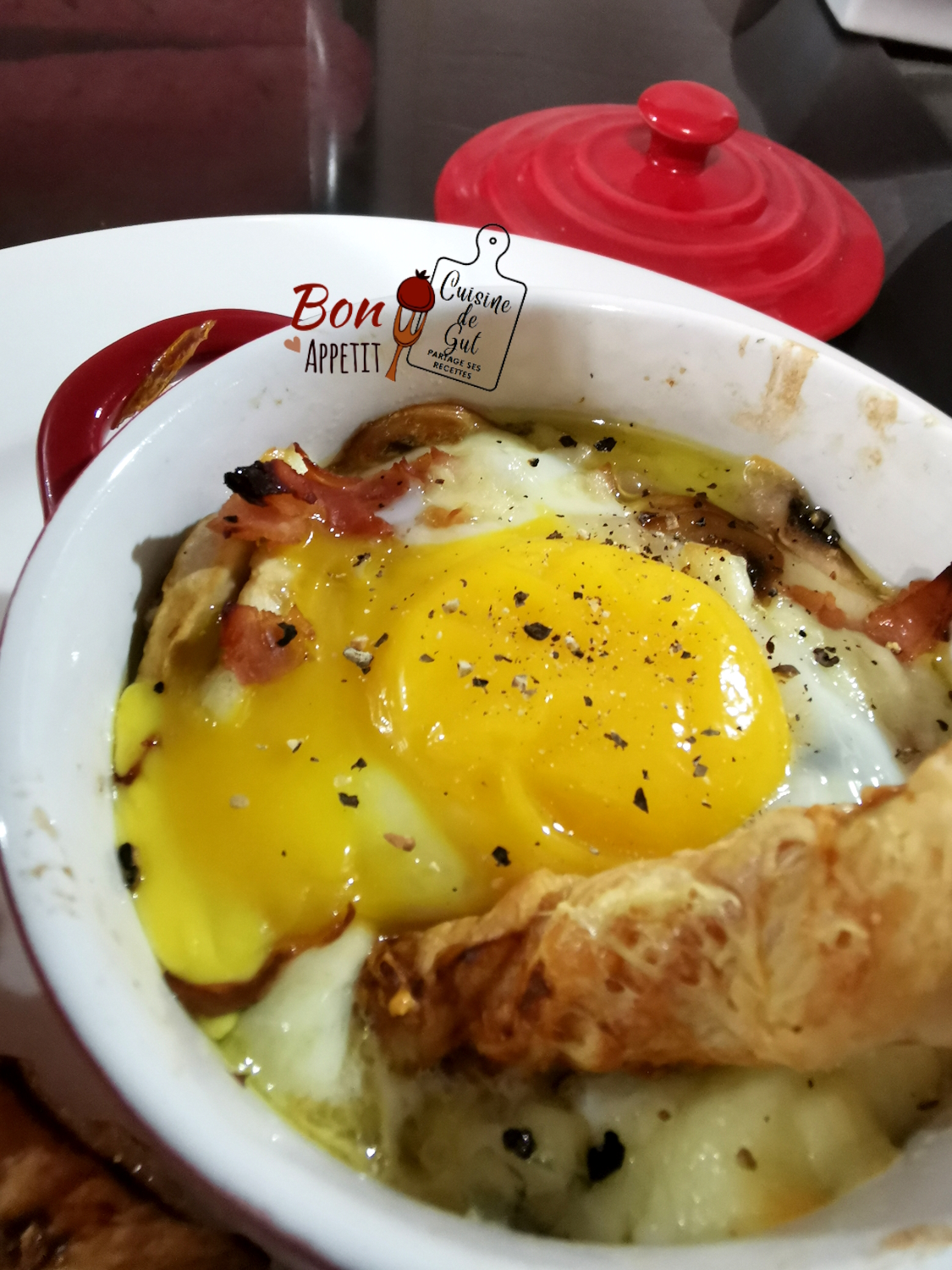 mais c’est tout de même dommage, un oeuf cocotte sans blanc ce n’est pas un oeuf cocotte ! Cette fois là j’ai eu envie de changer, j’ai séparé mes blancs des jaunes, puis j’ai fait cuire, dans un premier temps, les ingrédients seulement avec le blanc, ensuite j’ai sorti mes oeufs cocotte du four et j’ai ajouté le jaune, mis de côté, sur le dessus et j’ai enfourné à nouveau. Alors que pensez vous de cette idée ?