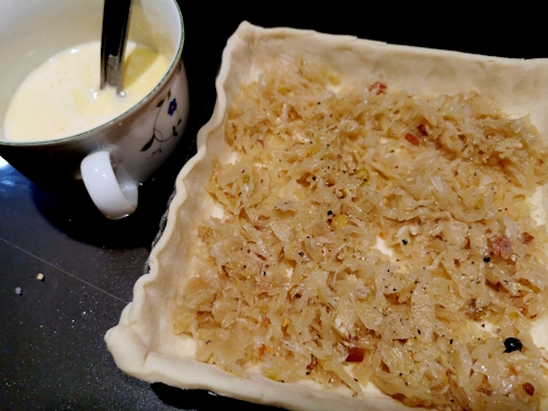 3. Quelle jolie tarte si appétissante ! penser à acheter trop de choucroute pour garder des restes ! pour ma part quand ça m’arrive je fais des hots dogs, moutarde, choucroute, saucisse d’Alsace : vite fait bien fait !