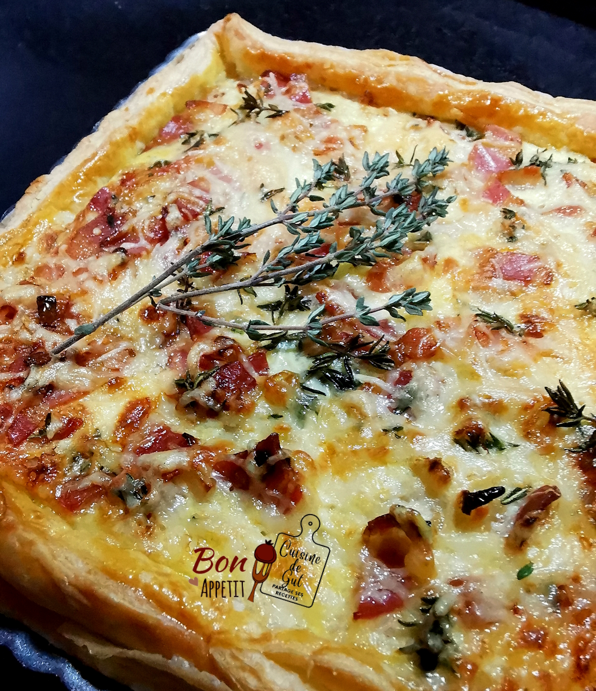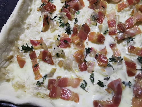 Allez on verra bien. J’ai juste ajouté des petits lardons fumés en coupant mes tranches de Lard Corse que j’adore et comme j’avais un petit bouquet de thym je me suis dis que ça la parfumerait bien ! J’ai tout de même prévenu mon mari que la tarte qu’il allait manger ce soir lui semblerait sans doute curieuse, mais je sais aussi qu’avec lui je peux tout faire du moment que je ne lui fais ni riz au lait ni cervelle ! Il aime tout autrement et ne critique jamais rien, le top quoi, j’aurais eu du mal avec un mari difficile !