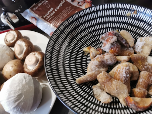 Bonjour !! De temps en temps il m’est utile de sortir les bacs du congélo pour faire un tri car j’ai un peu tendance à prendre ce qu’il y a dessus au lieu de fouiller car je n’aime pas laisser la porte du congélo ouverte trop longtemps. C’est alors dans ces moments là que je m’aperçois qu’il y a des petits paquets au fond. Ce fût le cas avec le reste d’un paquet de cèpes que j’avais acheté aux fêtes. Bien que j’ai une machine à souder qui permet de faire le vide et de souder mes paquets, il était temps de les terminer.