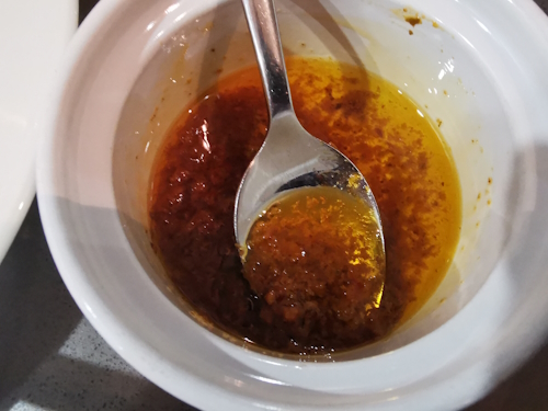 Vinaigre blanc Balsamique, huile d’olive, 1/2 cc de Pesto Rosso