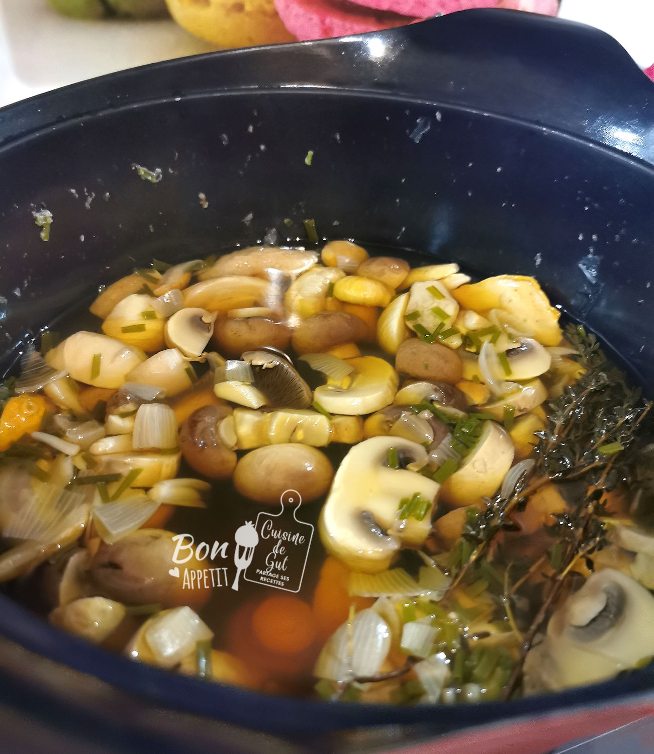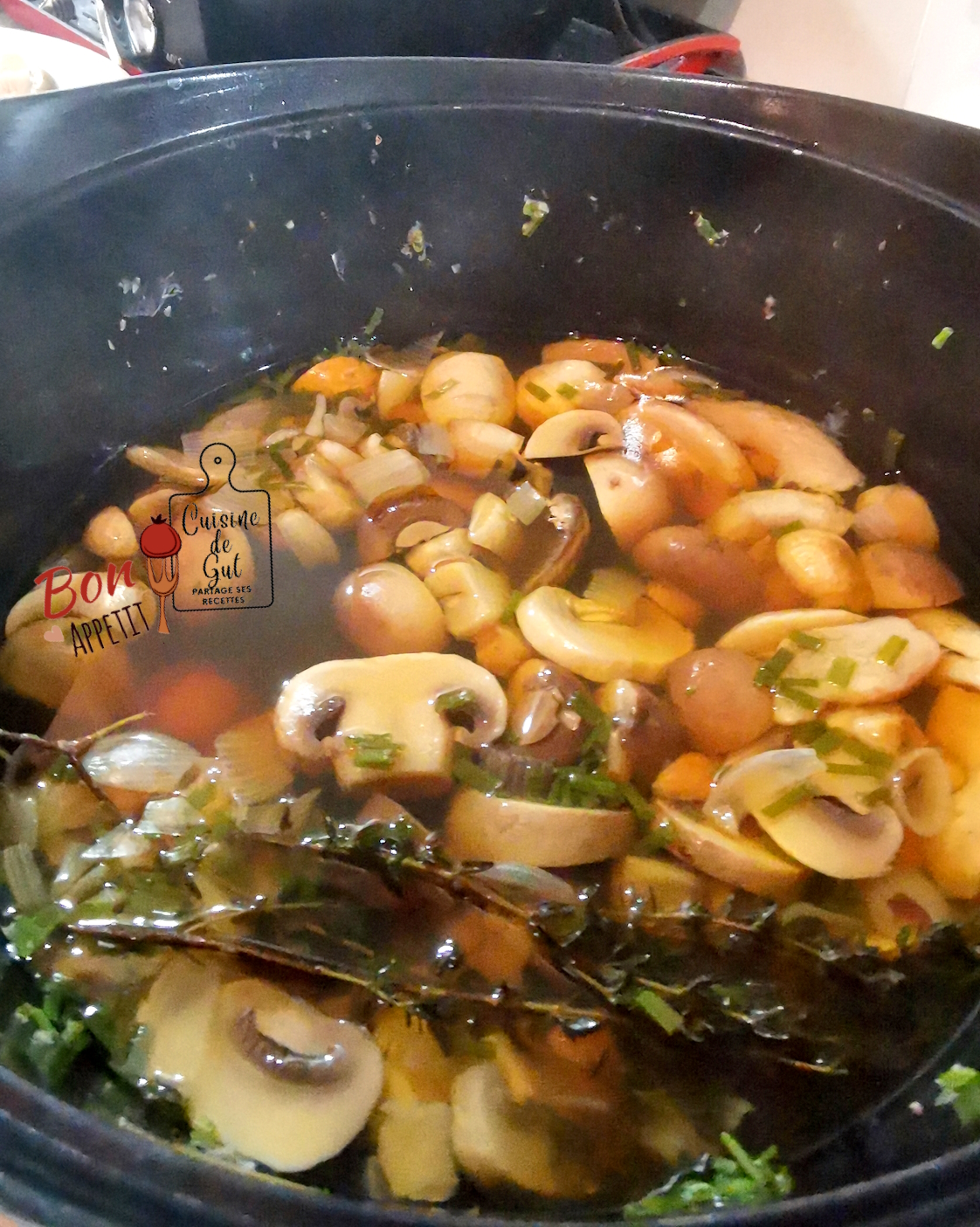 - Ajouter le bouillon de légumes (ou à défaut de l’eau) qui doit recouvrir les champignons (à compléter avec de l’eau éventuellement)