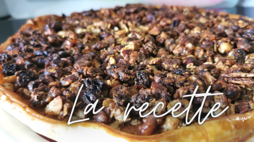 Bonjour !! Vous avez du vous rendre compte que je ne fais plus trop de gâteaux ? C’est trop pénible pour moi. Du temps où j’en faisais j’avais toujours d’avance des fruits secs de toutes sortes, des pépites de chocolat etc etc.. de ce fait j’avais pas mal de paquets à écouler. Il était temps que je m’en serve ! C’est en entendant la recette du jour de Cyril Lignac sur RTL que je me suis dit que cette tarte pourrait fort bien m’aider à utiliser mon stock. J’ai attendu un jour où je faisais des restes à manger le midi pour la réaliser pour que cela me prenne moins de temps à piétiner.