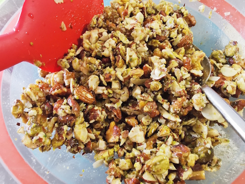 - Verser le miel sur les fruits secs et bien mélanger pour bien l’incorporer
