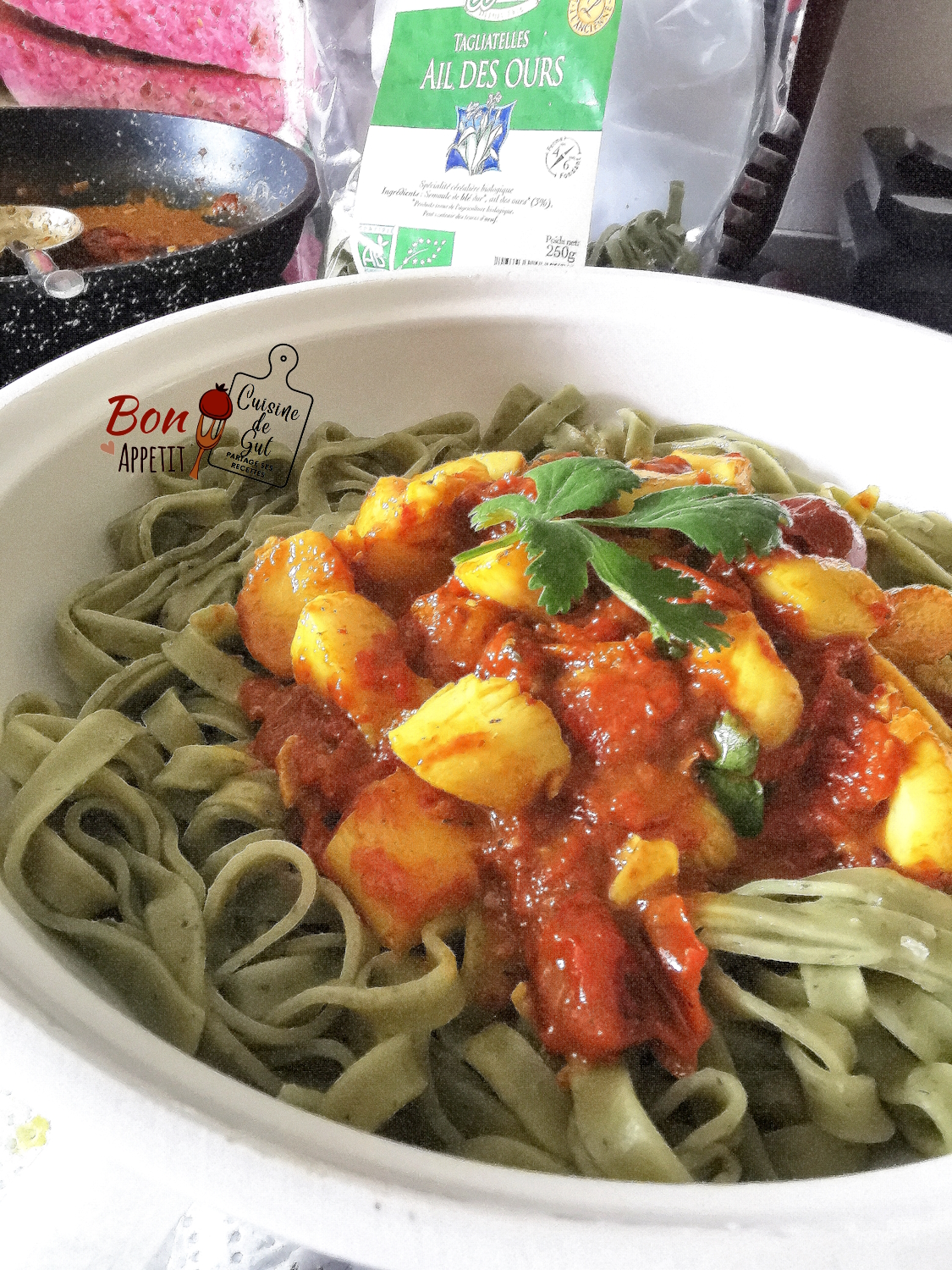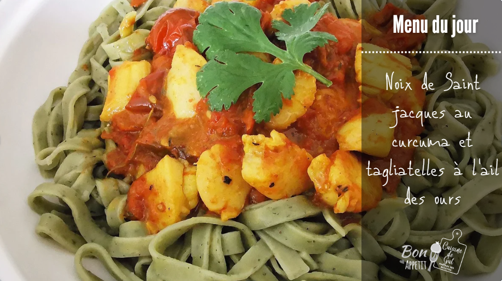 Bien sûr que c’était bon, très bon même mais si ces tagliatelles sont à l’ail des ours ils ont du en mettre une miette car elles n’avaient absolument pas le goût de l’ail des ours. Heureusement que j’avais fait cuire mes tomates avec de l’ail pour avoir la saveur attendue. Mariée au curcuma je trouve cette association délicieuse ! Encore un bon petit plat de Noix de st Jacques à mon actif. Plus simple mais gourmande.