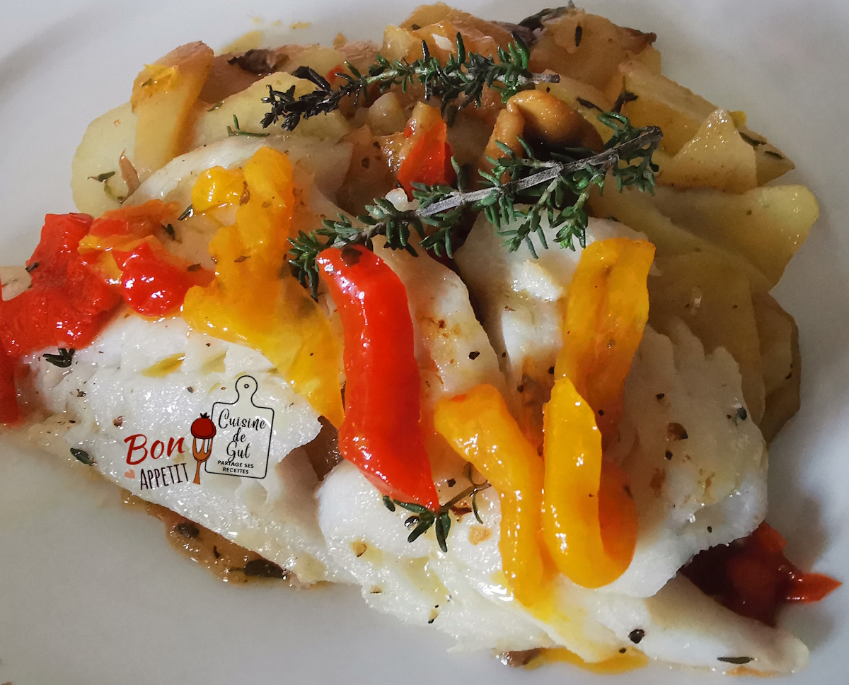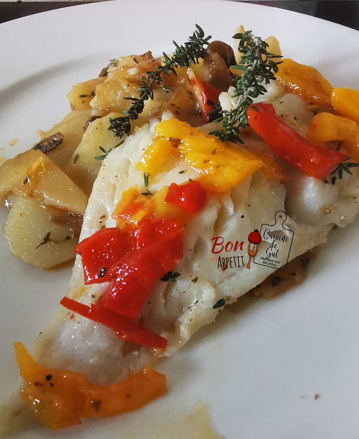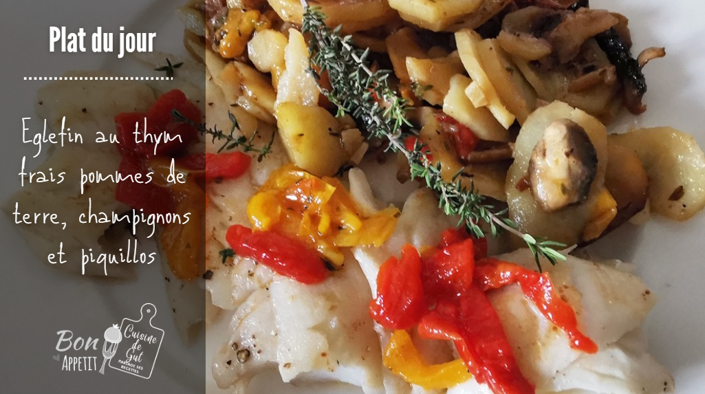 Eglefin au thym frais pommes de terre, champignons et piquillos