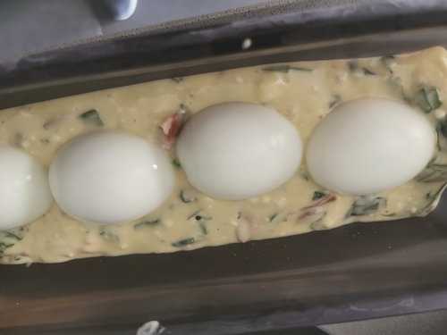 - Ajouter les 4 oeufs durs l’un derrière l’autre comme sur la photo ci-dessous