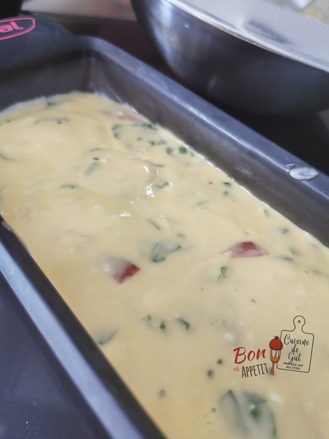 - Verser la moitié de la préparation dans un moule à cake beurré s’il n’est pas en silicone
